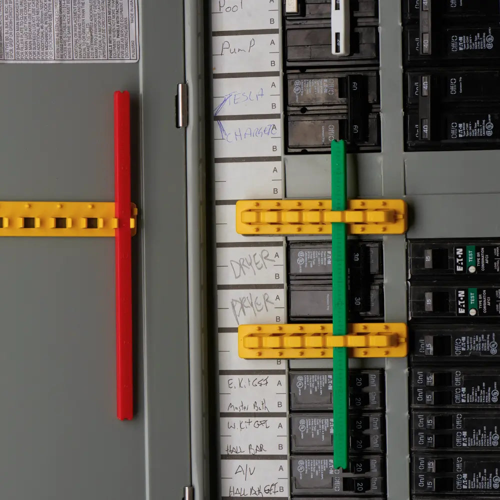 The Breaker Blocker Lockout Kit offers a versatile solution for locking out large and irregularly shaped breakers that standard clamp-on locks can't handle. This kit includes two blocking bars (red and green) and two yellow mounting rails, designed to securely lock breaker switches in either the ON or OFF position. A third rail is included for convenient storage of the blocking bars when not in use.