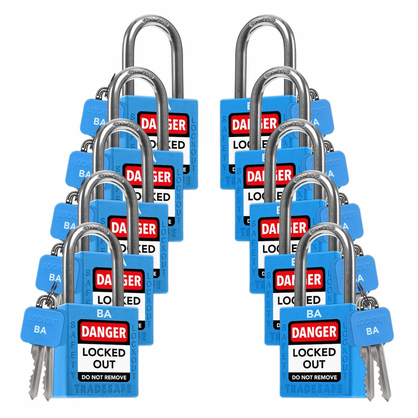 - (10) Blue Keyed Alike Unlimited Lockout Tag Out Locks made of heavy-duty, non-conductive nylon unibody, corrosion-resistant stainless steel shackle, key-retaining brass core cylinder; 2 keys per lock